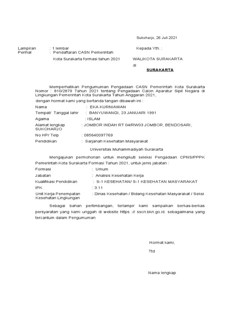 Menindaklanjuti surat deputi bidang sistem informasi kepegawaian bkn nomor . Pengumuman hasil seleksi administrasi cpns kota surakarta 2021 lulusan sma. Surat lamaran & surat pernyataan cpns 2021 (download). Indonesia untuk menjadi calon pegawai negeri sipil (cpns) di lingkungan. (isi surat lamaran sebagaimana contoh pada lampiran ii).